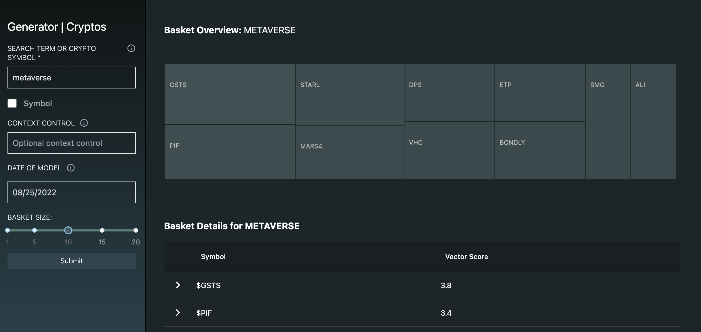 Navigate the sea of cryptos using the power of our scientific data engineering pipelines. Enter a crypto query and get a list of cryptos based on hidden relationships for long or short investing.